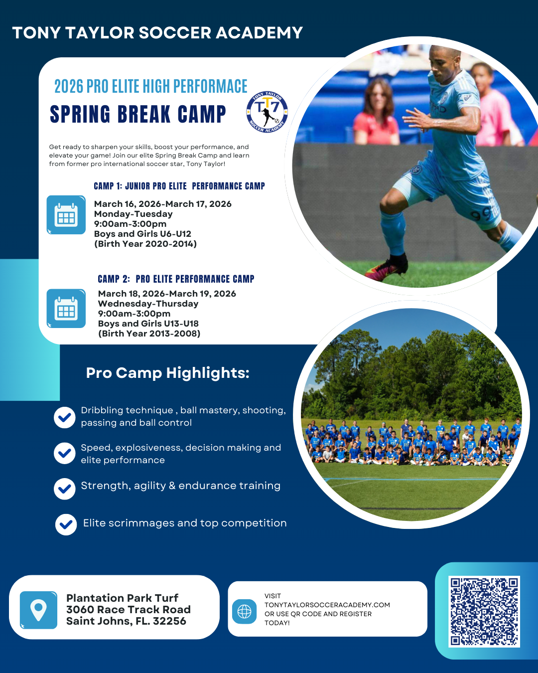 Join Tony Taylor Soccer Academy this Spring Break for a professional, high-performance training experience led by former pro international soccer player Tony Taylor. This camp is designed for committed players who want to develop technically, physically, and mentally in a competitive environment.